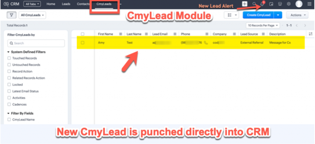 Step 3: The integration is ready to use . Once a new lead comes into CmyLeads , it will be added instantly into CmyLeads module of Zoho Crm