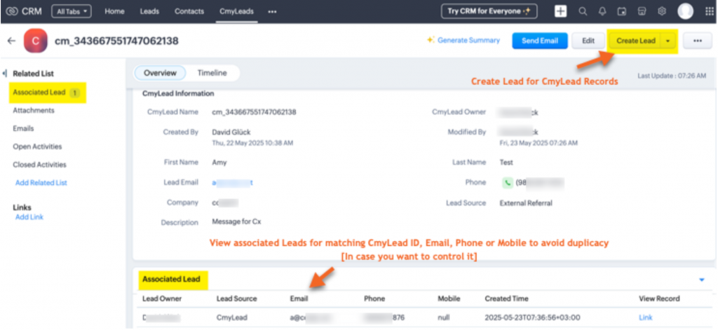 • >> Before you click to add leads from the CmyLeads module, please check for duplicated records under the “Associated Leads” section . The data is searched in this section for matching mobile , phone , email id and/or CmyLead_ID . So this avoids to create any duplicate record in leads module unnecessarily.