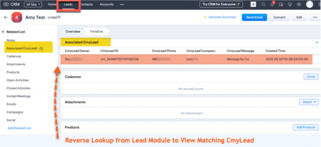 • >> View matching Leads from CmyLeads module on the basis of matching CmyLead ID, Email, Phone & Mobile.
