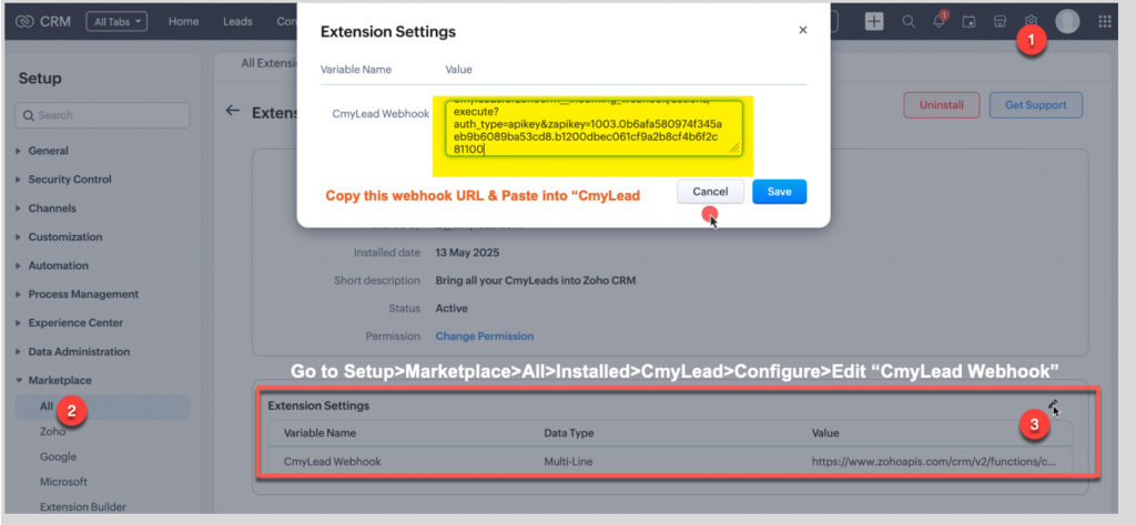 • Once you install the extension go to Setup>Marketplace>All>Installed>CmyLead>Configure>Edit “CmyLead Webhook”